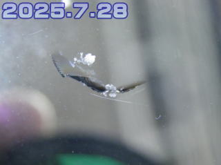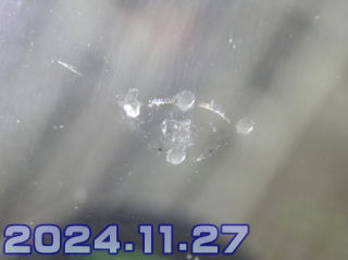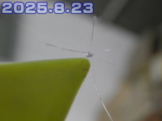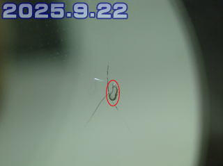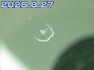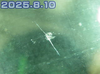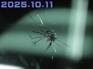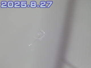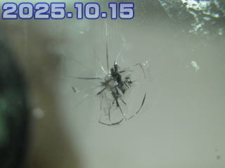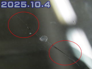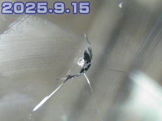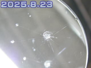 宝塚のデントリペア店さんでリペアをされたようです。衝撃点が2つあるひび割れです。ほとんどレジンが浸透していないです。専門店でこのリペアは酷すぎます。 |