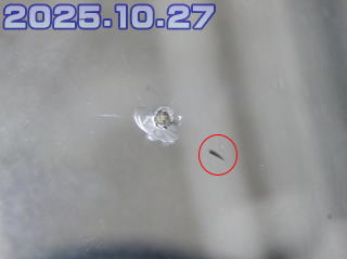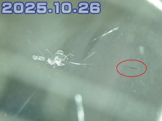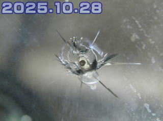 衝撃点からレジンが入っていないので、新たにドリルで穴を開けようとしてドリルの刃を滑らせてU字型のキズを付けたようです。